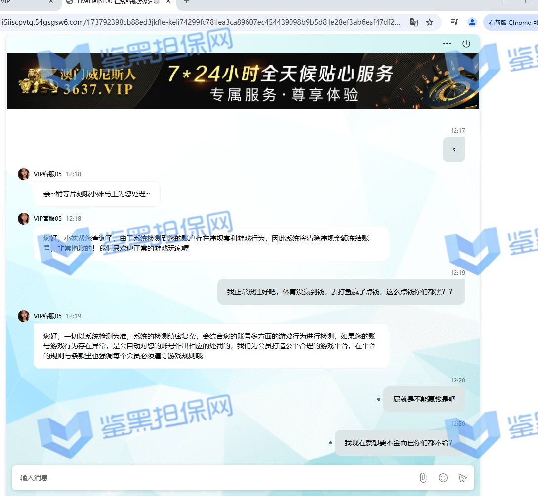 2025年1月23日下午我接到他们客服的电话邀请注册,说最高可以领288的彩金,我觉得这个平台不错挺大气的,就充了500元试试水。 因为他们平台我看是要求一倍流水提现,所以我就打到1300元申请了第一次提现,结果失败了,他们客服说让我打注册彩金288的5倍1440元才能提款,我就去他们指定的PG电子去打流水,当天晚上打够流水以后找他们提款再次失败,又改口说要打够提现余额的1300*5倍=6500元的流水才能提现。从第二次给我退回来以后他们给我后台修改了PG电子的赔率,损失从15%提高到50%,我一算账根本不够,然后我就又去打了百家乐,想着输完就不提,赢了就去刷流水,也是运气好,从1300元梭哈到5000多元,回来刷了一晚上的PG电子,一直到1月24日的中午,才刷够流水。1月23日刷了2000多流水亏了300多,差不多15%的亏损,第二天刷了4000多亏损超过2300元,我也没说什么,想着打够就提现吧。然后1月24日我去申请提现,客服先给我提了个88元,然后再提的时候以不足vip1为由让我继续充值700元到vip1,我又充了700,然后又去申请提现,提现后又给我拒绝了,说要我再充值1000元才能使用钱包收款,这回已经引起我的警觉了,我就和他们客服再三确认,这回充1000一定没问题了吧!他们客服拍着胸脯说百分之百一定能提现,给我保证,我就又充了一千。冲进去以后我申请提现又失败了,理由是资金风控让我再充值余额一半的钱也就是4000多元解除风控(我的资金是工资卡没有任何问题),他们客服就变成了复读机,一直让我继续充值,我说什么都没用,我说刚才不是百分之百能提现成功吗?他们也不理我,说这次百分之百能提成功。所以他们平台是输了钱算我倒霉,赢了钱就开始连环套路骗钱的骗子平台 以下是我经过技术手段查到的该平台的所有域名(我本人是计算机科班出身) 威尼斯人: wn88.vip vn600.top vn601.top vn602.top vn603.top vn604.top vn605.top vn606.top vn607.top vn608.top vn609.top vn610.top wn880.top wn881.top wn882.top wn883.top wn884.top wn885.top wn886.top wn887.top wn888.top wn889.top wn890.top wn891.top wn892.top wn893.top wn894.top wn895.top wn896.top wn897.top wn898.top wn899.top vn4456.com vn4457.com 81157.cc 元大娱乐城(同一个主体运营的另一家平台): yd7575.com yd9568.com yd3637.com yd3690.com yd5748.com yd9928.com yd3657.com yd2234.com yd1238.com yd1239.com yd1237.com yd2235.com yd1230.com yd1236.com yd1235.com
