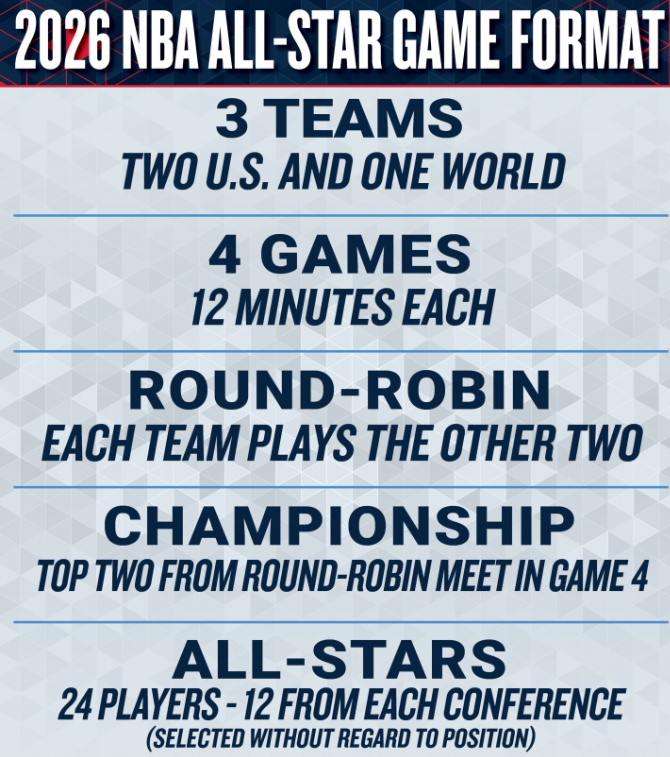 按照下个月调整后的全明星赛赛制,本次全明星的组队目标为选拔16名美国本土球员和8名国际球员,采用美国队对阵世界队的循环赛制。(若某一阵营的球员数量不足,联盟会扩充候选球员池,就像NBA总裁萧华针对实际投票结果会采取的做法一样。)